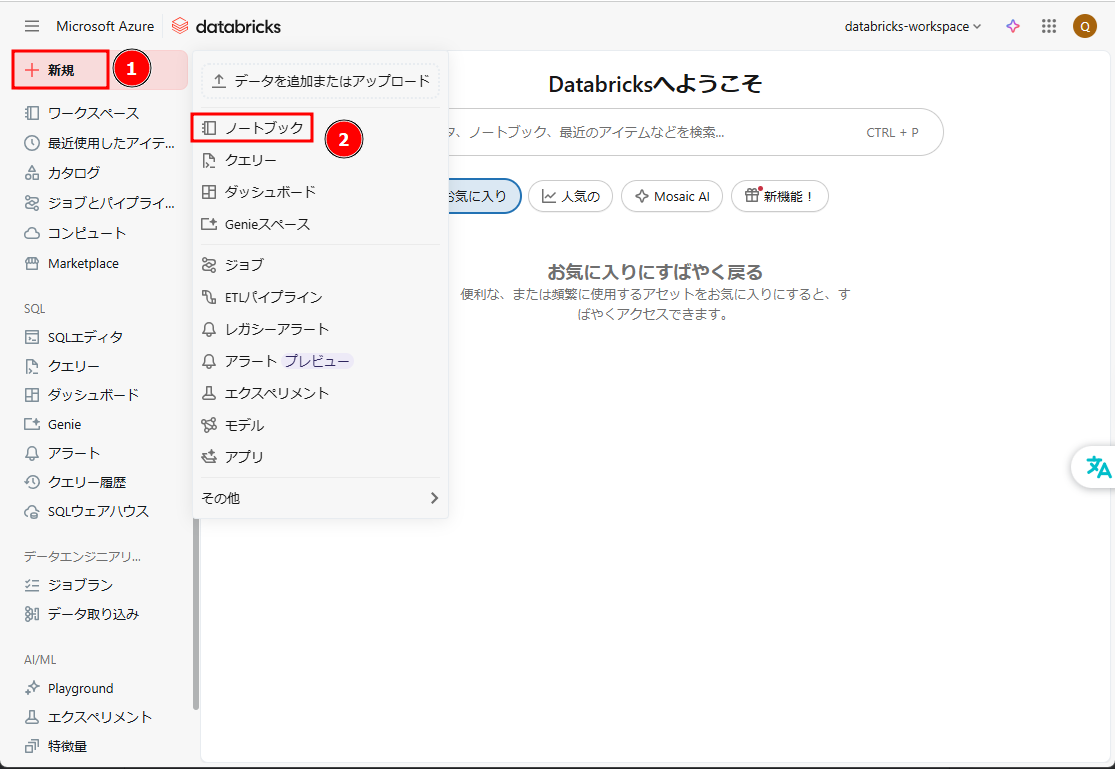 ⑧ Databricksワークスペース画面から → 「新規」 → 「ノートブック」