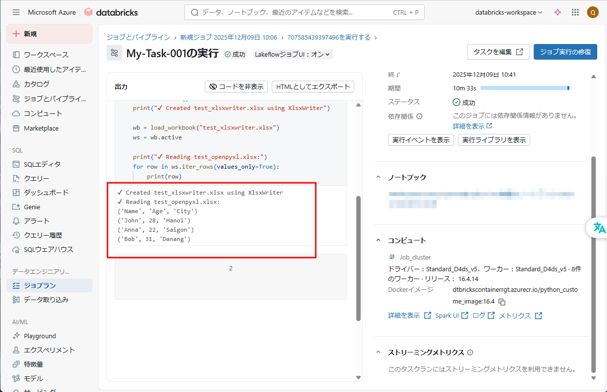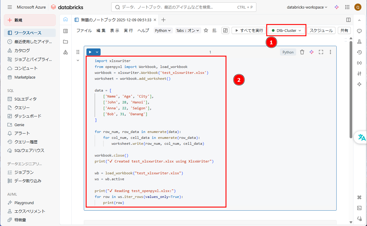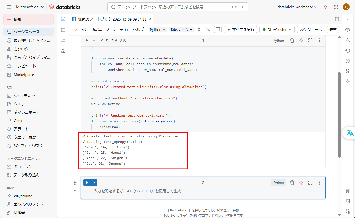 「XlsxWriter」と「openpyxl」ライブラリを利用したノートブックを作成し、汎用クラスターを確認します。