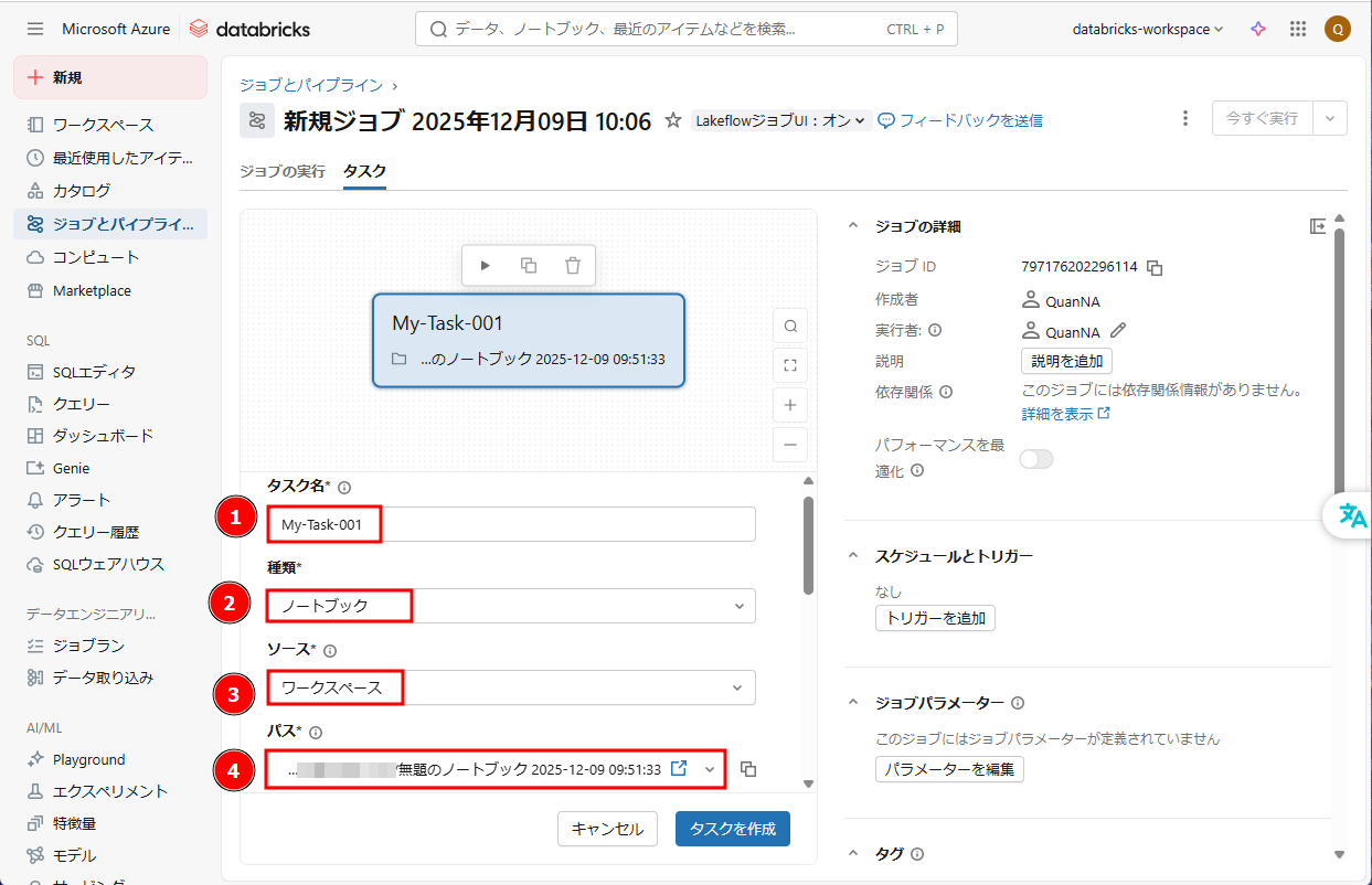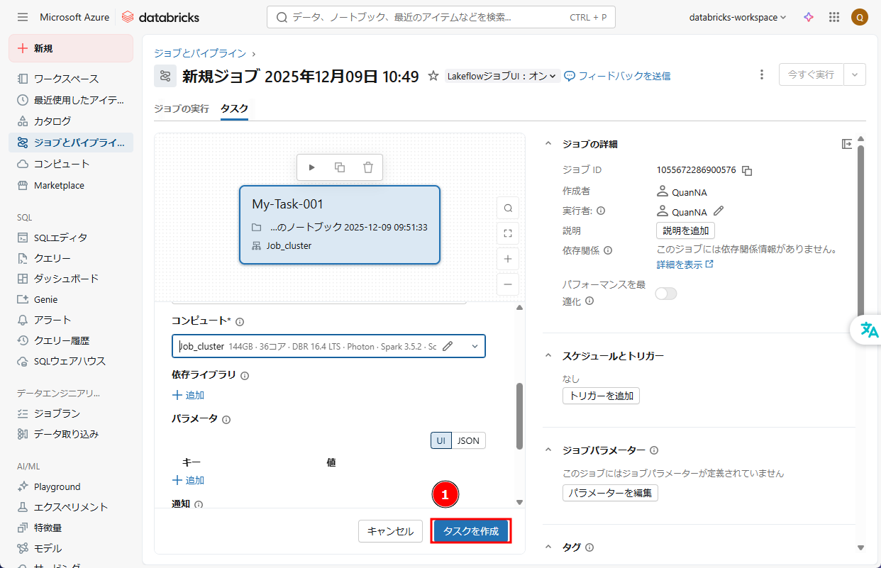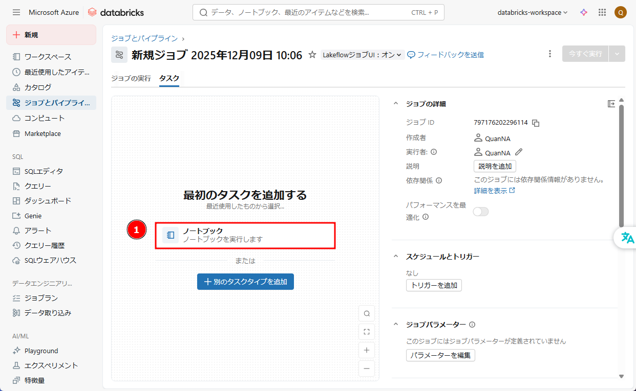 ① Databricksワークスペース画面から、「ジョブとパイプライン」 → 「作成」→「ジョブ」をクリックします。