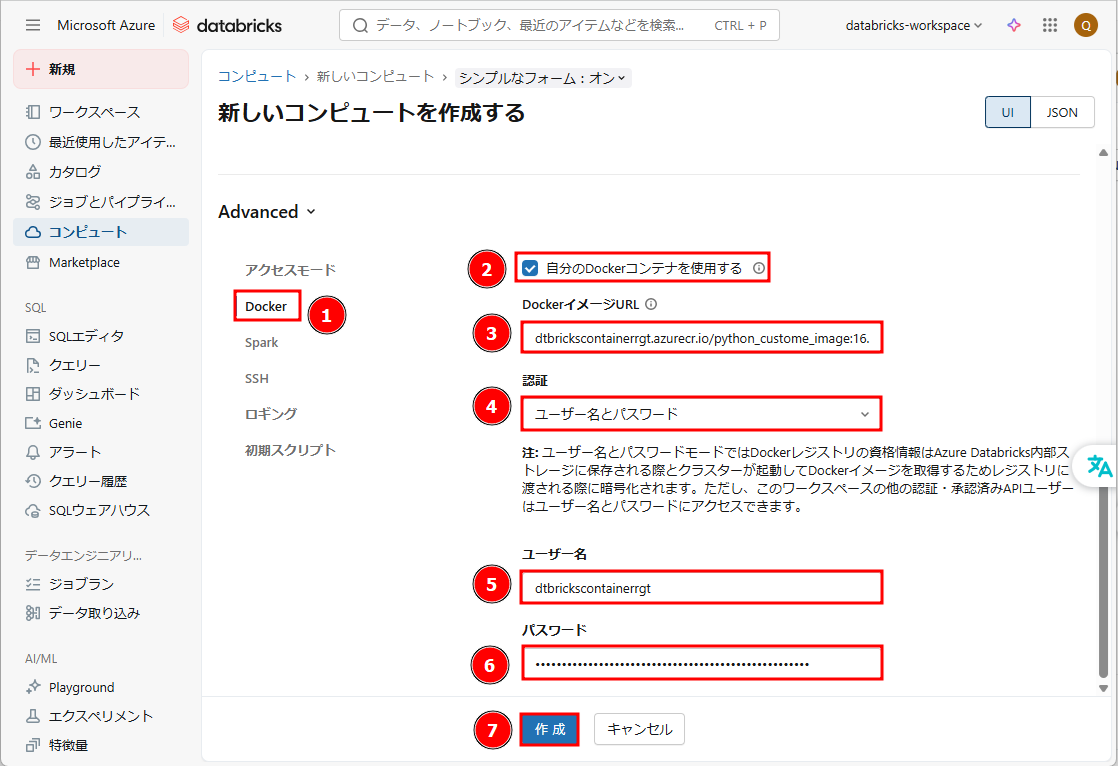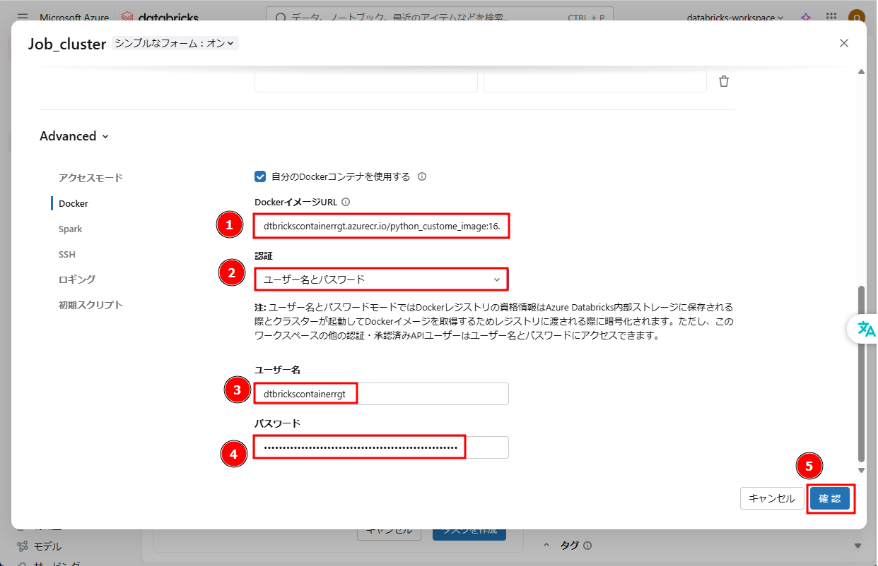 ⑧ ユーザー名とパスワードを入力します。Azureコンテナーレジストリの「アクセス キー」からユーザー名とパスワードを取得できます。