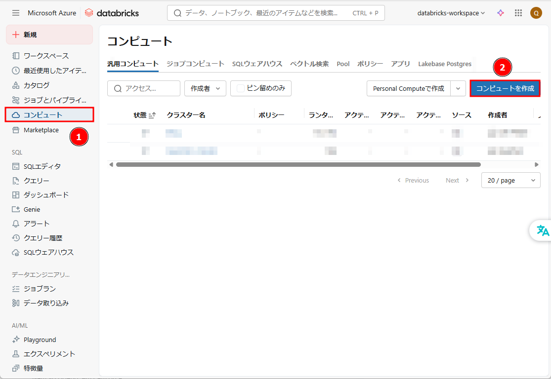① Databricks画面から、「コンピュート」 →「コンピュートを作成」をクリックします。