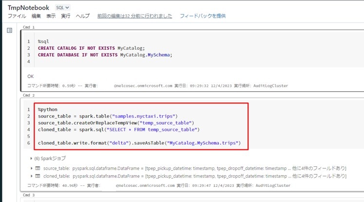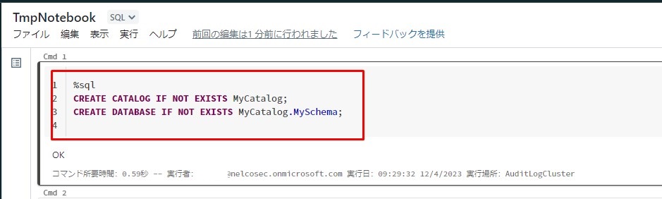 ①「MyCatalog」カタログ及び「MySchema」スキーマを作成するにノートブックを開き、以下のコードをコピーして実行します。