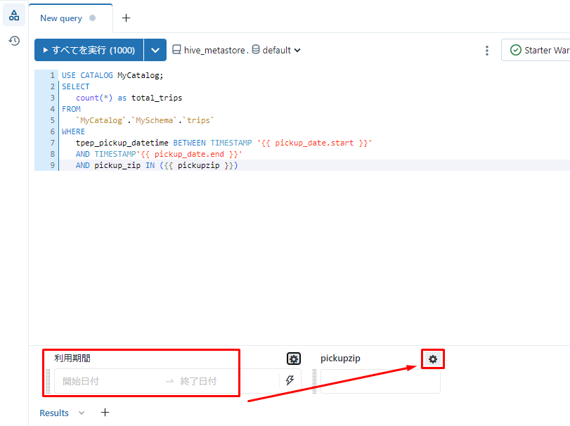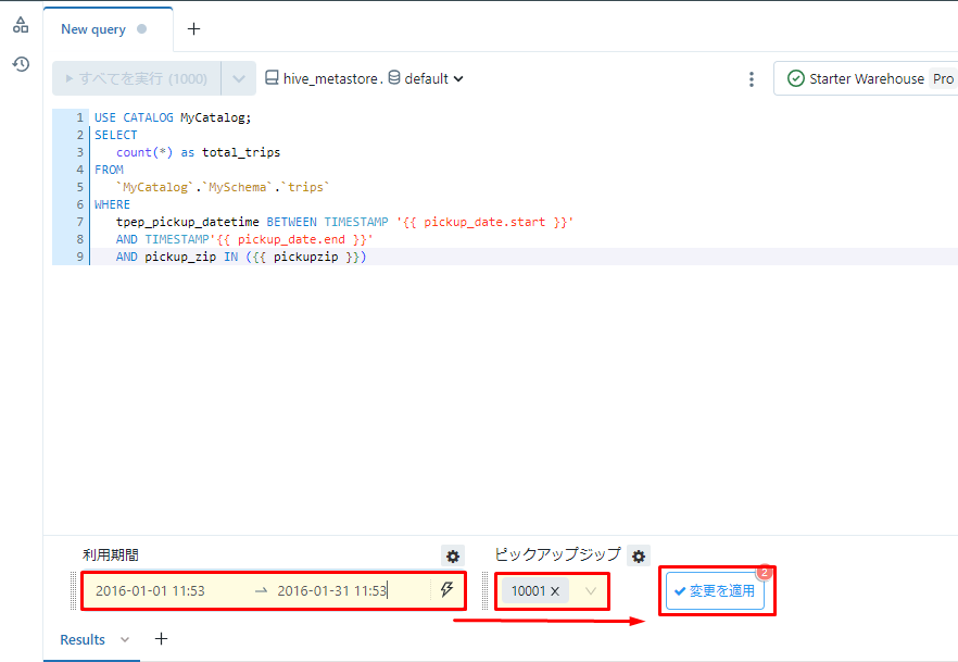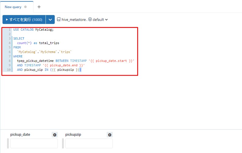 USE CATALOG MyCatalog; SELECT count(*) as total_trips FROM `MyCatalog`.`MySchema`.`trips` WHERE tpep_pickup_datetime BETWEEN TIMESTAMP '{{ pickup_date.start }}' AND TIMESTAMP'{{ pickup_date.end }}' AND pickup_zip IN ({{ pickupzip }}) |
