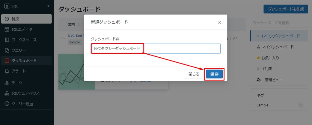 ②表示されるダイアログでダッシュボードの名前を入力できます。例えば、「NYCタクシーダッシュボード」と入力し、「保存」をクリックします。