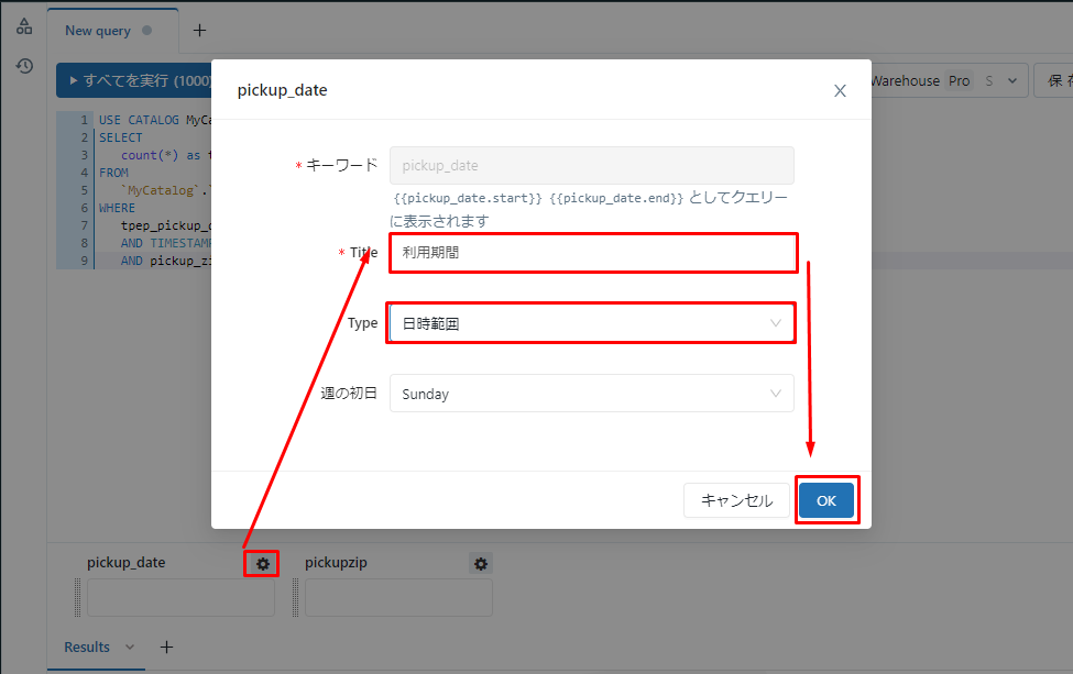 ④「Type」項目で「日時範囲」を選択して、「OK」をクリックします。