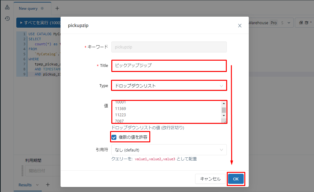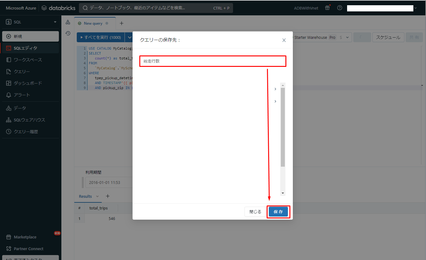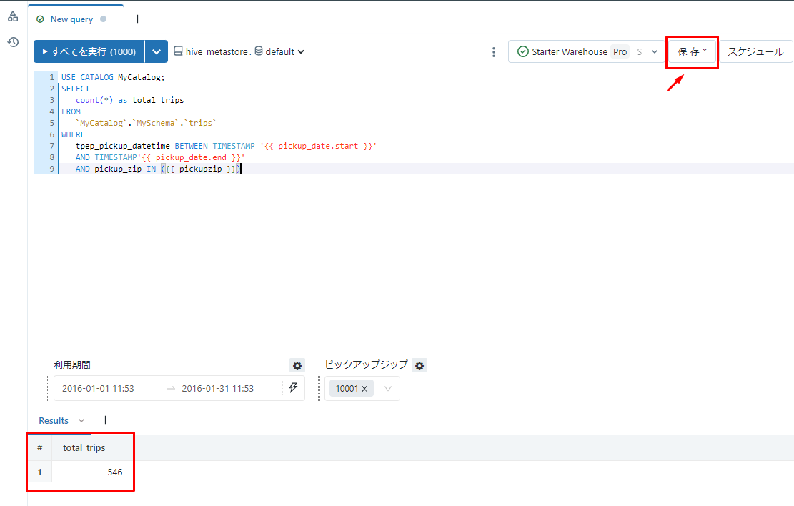 ⑩pickup_zip が 10001 となる場合、2016年1月の総走行数が以下の画像の通りに出力されます。 「保存」をクリックしてクエリを保存します。