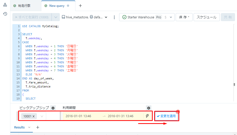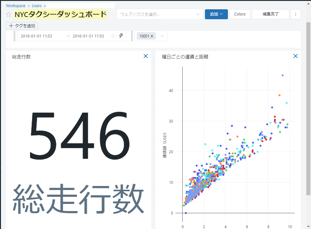 ③総走行数の可視化と同じように「pickupzip」と「pickup_date」の2つテキストボックスを以下の2つテキストボックスに変更します。情報を入力して「変更を適用」をクリックすると、クエリの結果が表示されます。