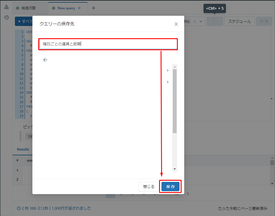 ⑤クエリに「曜日ごとの運賃と距離」等の名前を付けて「保存」をクリックします。