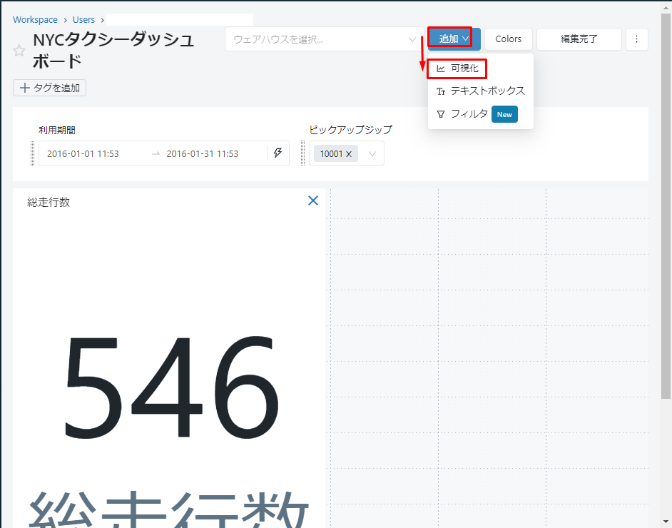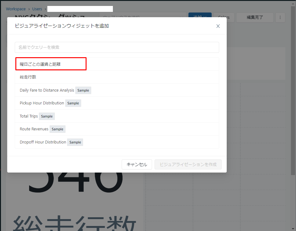 ①サイドバーで「ダッシュボード」をクリックして、「NYCタクシーダッシュボード」を選択します。