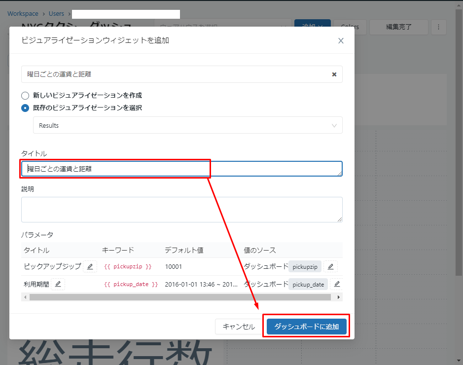 ⑤「タイトル」項目で「曜日ごとの運賃と距離」等の情報を入力して、「ダッシュボードに追加」をクリックします。