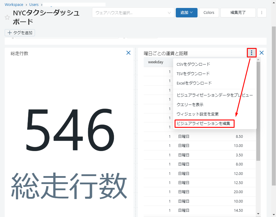 ⑦ビジュアライゼーション「曜日ごとの運賃と距離」にマウスを移動して  をクリックして、「ビジュアライゼーションを編集」を選択します。