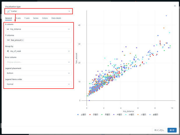 ⑨「X column」で「trip_distance」 を選択して、 「Y columns」 で「fare_amount」を選択します。