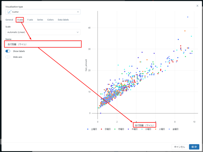 ⑪「X axis」タブに移動して、「Name」項目で「走行距離(マイル)」等の期待値を入力すると、その値がグラフの横軸の下に表示されます。