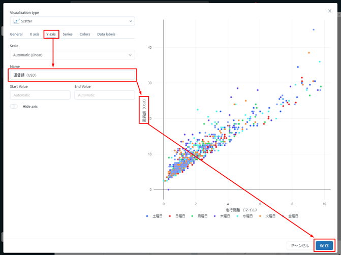 ⑫「Y axis」タブに移動して、「Name」項目で「運賃額(USD)」等の期待値を入力すると、その値がグラフの縦軸の下に表示されます。「保存」をクリックします。