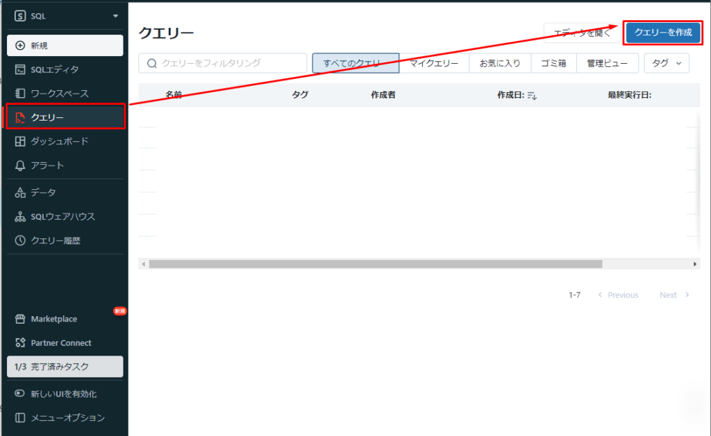①サイドバーで「クエリー」をクリックして、「クエリーを作成」を選択すると、SQLエディタの画面が表示されます。
