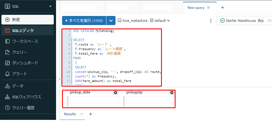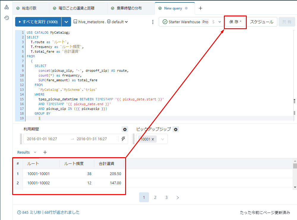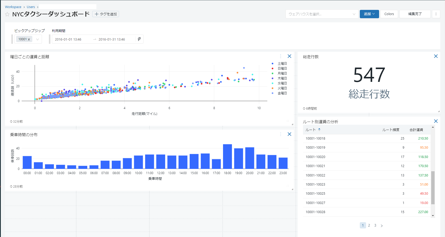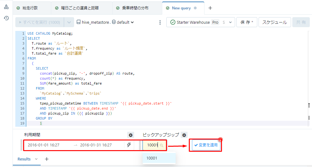 ③総走行数の可視化と同じように「pickupzip」と「pickup_date」の2つテキストボックスを以下の2つテキストボックスに変更します。情報を入力して「変更を適用」をクリックすると、クエリの結果が表示されます。
