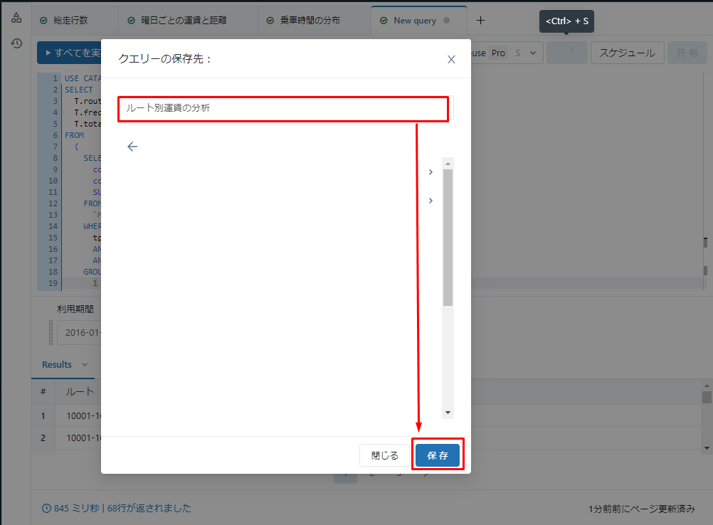 ⑤クエリに「 ルート別運賃の分析 」等の名前を付けて「保存」をクリックします。