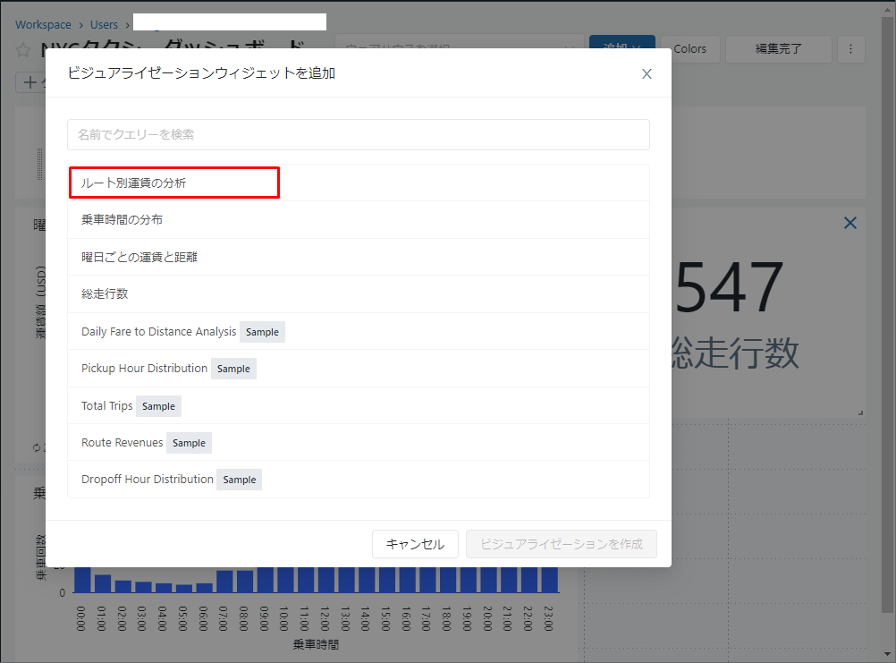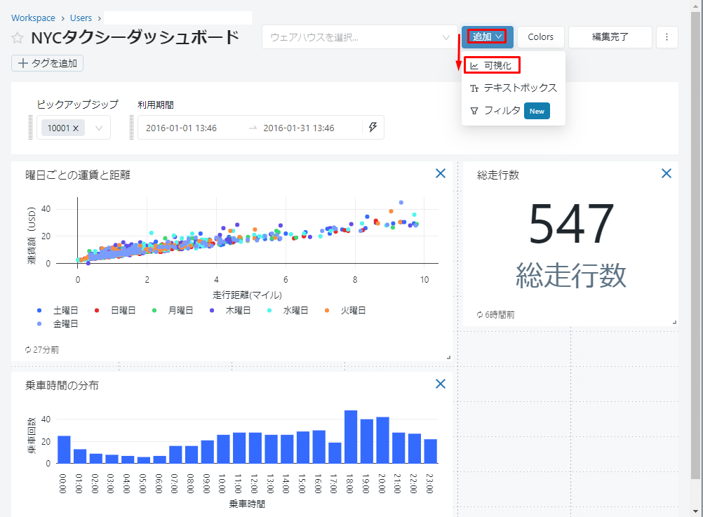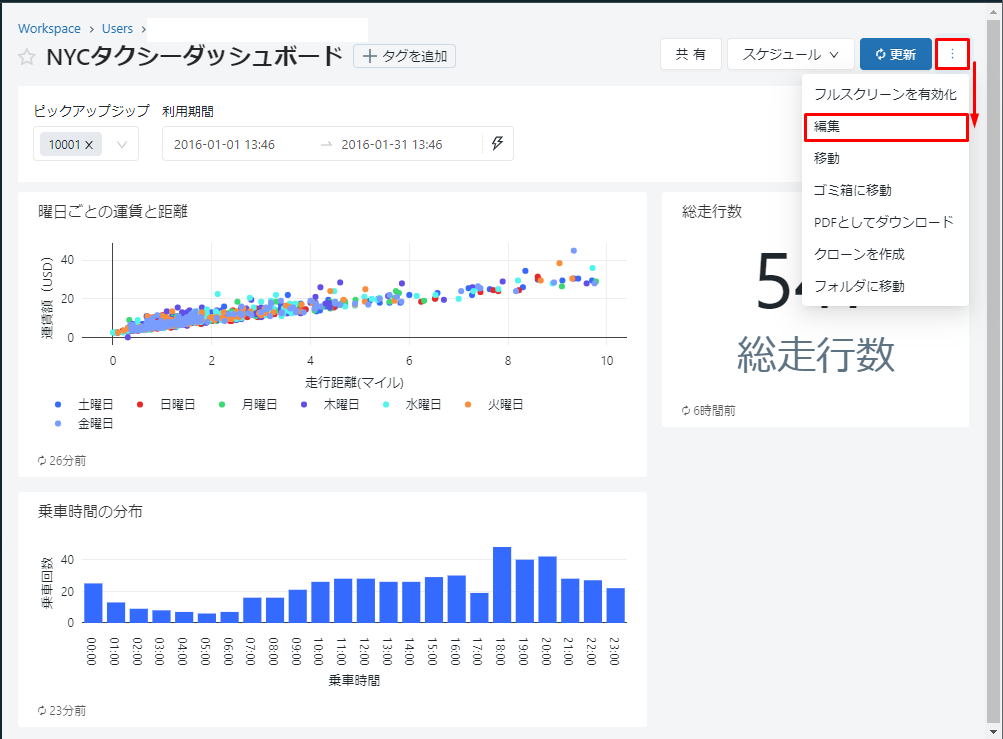 ①サイドバーで「ダッシュボード」をクリックして、「NYCタクシーダッシュボード」を選択します。