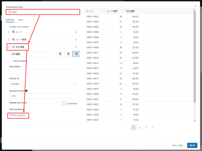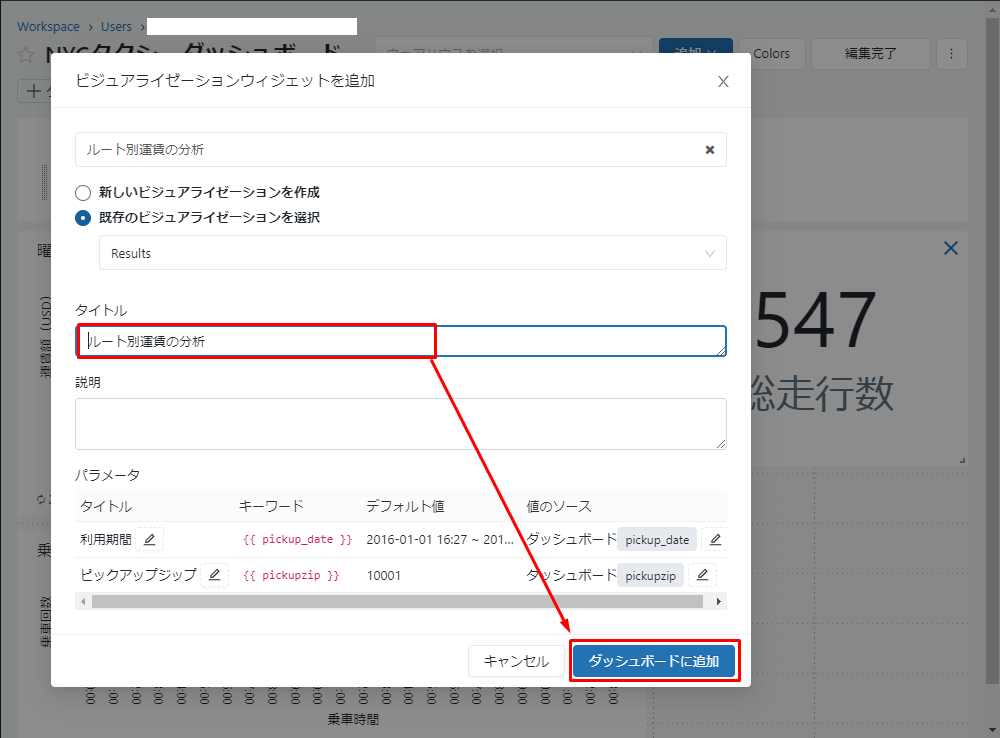 ⑤「タイトル」項目で「ルート別運賃の分析」等の情報を入力して、「ダッシュボードに追加」をクリックします。