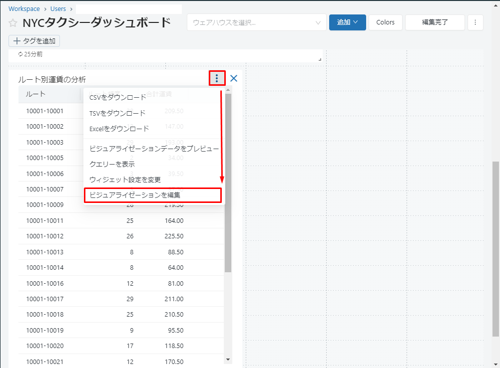 ⑦ビジュアライゼーション「ルート別運賃の分析」にマウスを移動して  をクリックして、「ビジュアライゼーションを編集」を選択します。