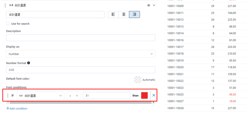 ⑨「 合計運賃 」を選択して「Add condition」をクリックします。