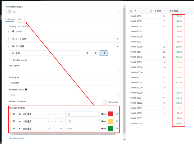 ⑬次に、希望の条件を追加します。「合計運賃」列が以下のように表示されます。「Grid」タブをクリックします。