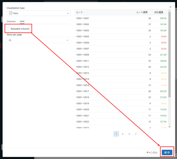 ⑭「Grid」タブで「Resizable columns」チェックボックスを無効にして「保存」ボタンをクリックします。