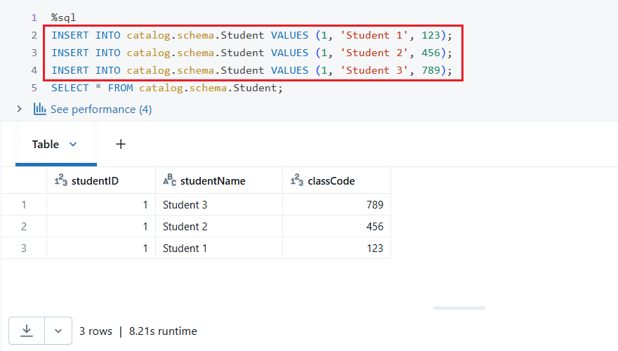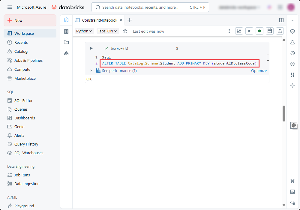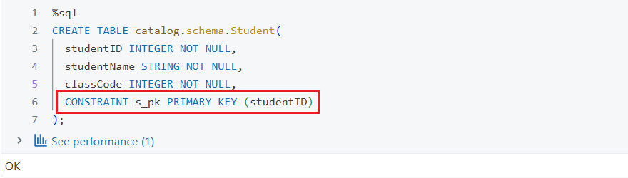 上記のコードをノートブックにコピーして、【Shift】キーと【Enter】キーを押します。コードは、「studentID + classCode」2つカラムを「Student」テーブルの主キーとして使用します。主キー名は「テーブル名」_pkとして自動的に追加されます。