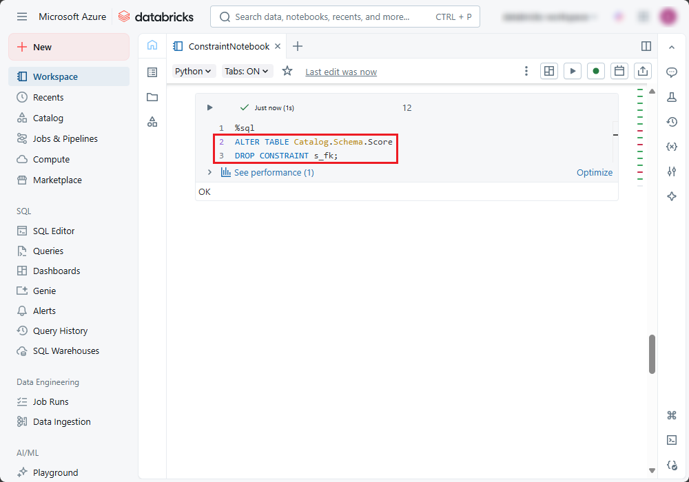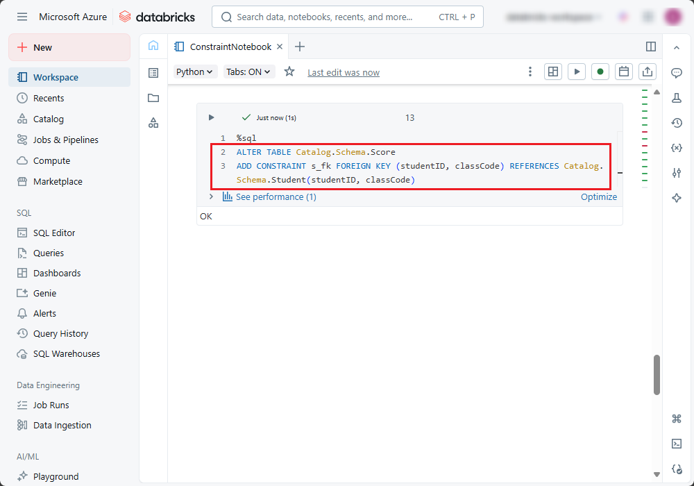 上記のコードをノートブックにコピーして、【Shift】キーと【Enter】キーを押します。「Student」テーブルの「s_fk」外部キーが削除されます。