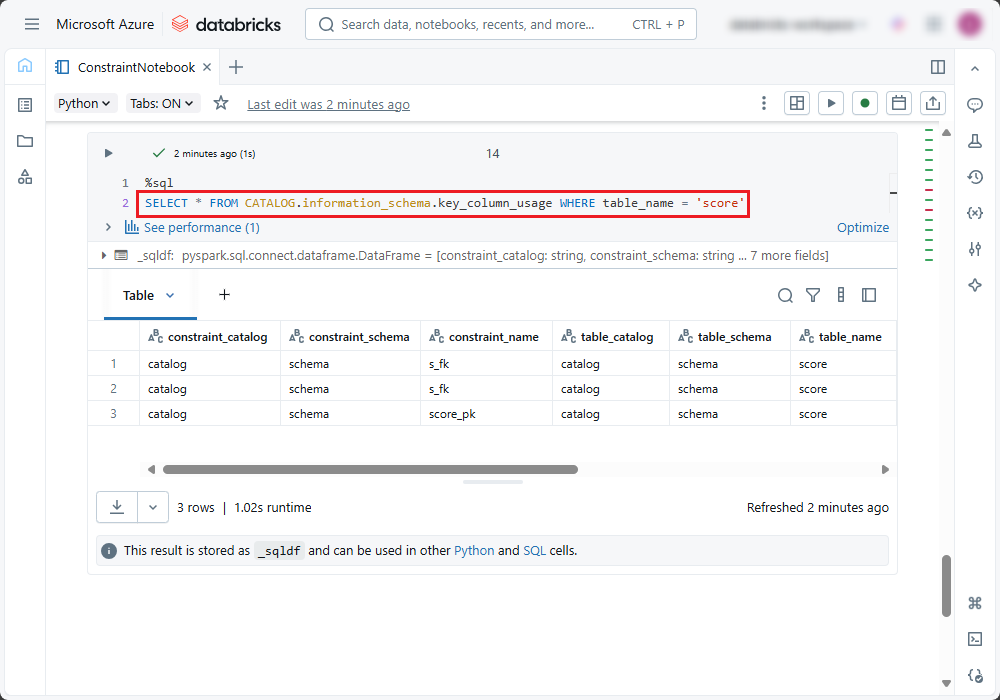 上記のコードをノートブックにコピーして、【Shift】キーと【Enter】キーを押します。「Score」テーブルの外部キーの内容を確認できます。