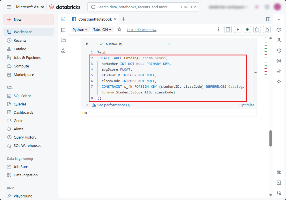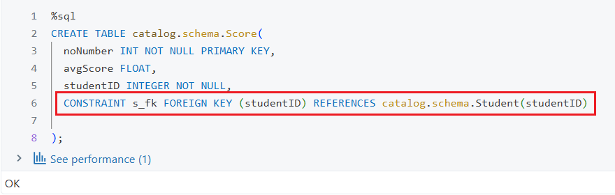 上記のコードをノートブックにコピーして、【Shift】キーと【Enter】キーを押します。コードは、「studentID + classCode」の2つカラムを「Score」テーブルの「s_fk」外部キーとして作成します。