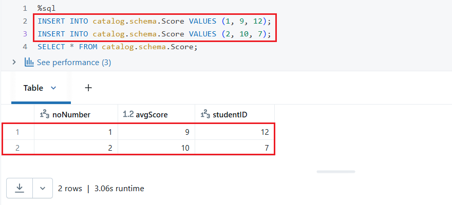 ② [Student]テーブル がない [studentID] の値を持つ 2 つのレコードを [Score]テーブル に挿入します。