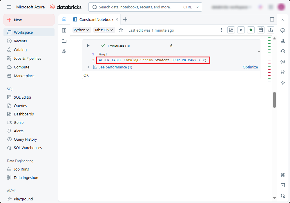 上記のコードをノートブックにコピーして、【Shift】キーと【Enter】キーを押します。作成した「Student」テーブルの主キーが削除されます。