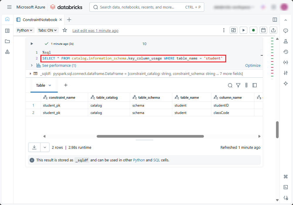 上記のコードをノートブックにコピーして、【Shift】キーと【Enter】キーを押します。「Student」テーブルの主キーの内容を確認できます。