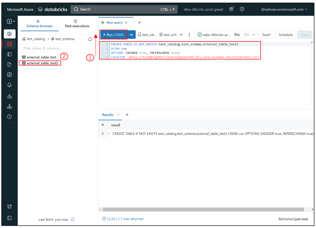 CREATE TABLE IF NOT EXISTS test_catalog.test_schema.ecternal_table_test2 USING CSV OPTIONS (HEADER true, INFERSCHEMA true) LOCATION 'abfss://test@stgdtbricksprodjpeast999.dfs.core.windows.net/test0/test.csv' |