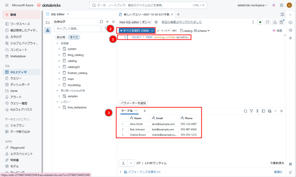 • [PARQUET_PATH]: 外部ロケーションに保存したsample.parquetファイルのパスを入力します。