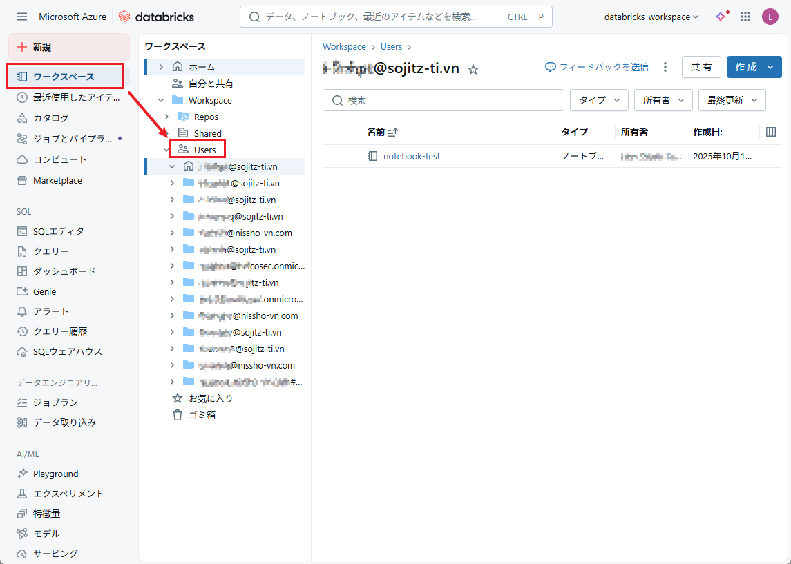②Azure Databricksポータル画面で、ワークスペース > Users > ユーザー名を選択します。