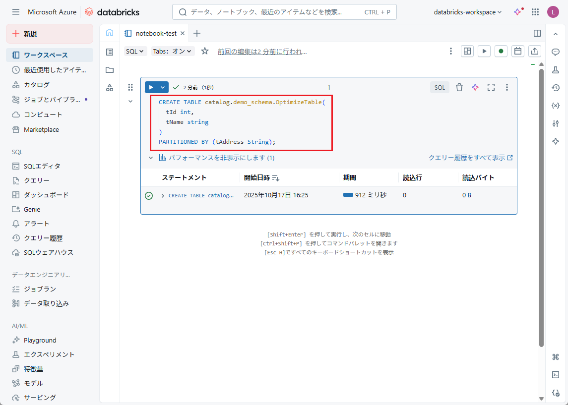 ・テーブル全体にOPTIMIZEコマンドを入力しRUNを実行する