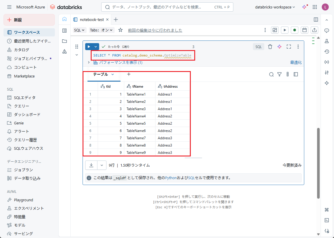 今回のブログでは、OptimizeTableというデモ用のテーブルを作成し、