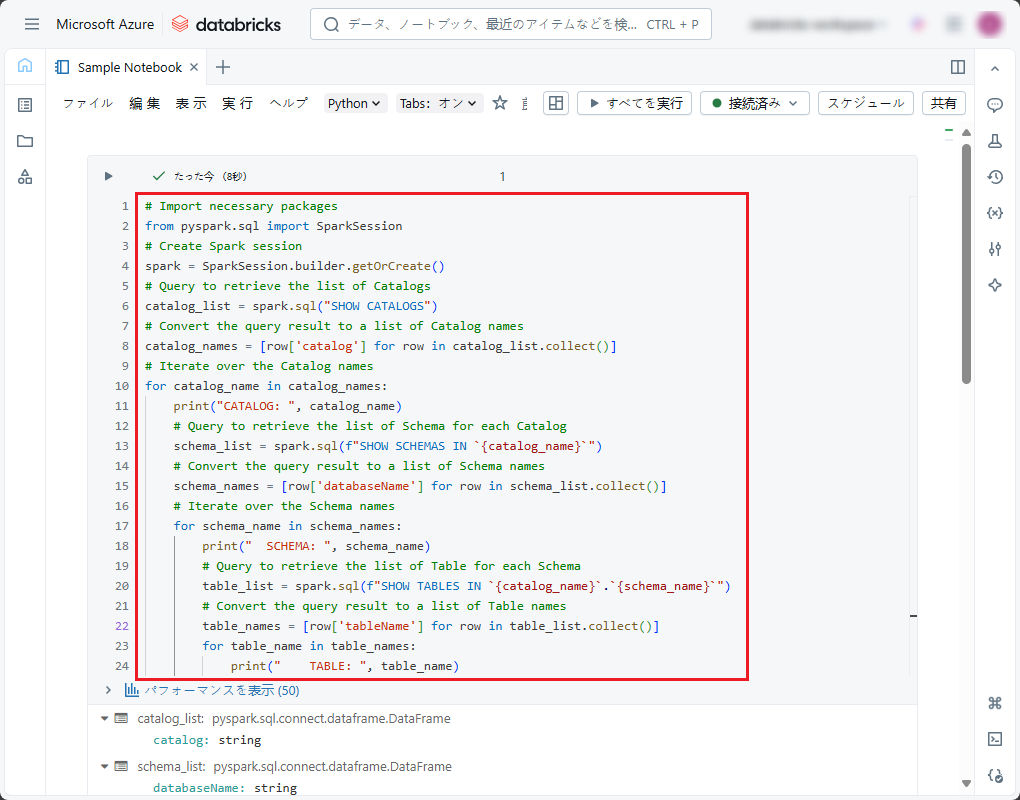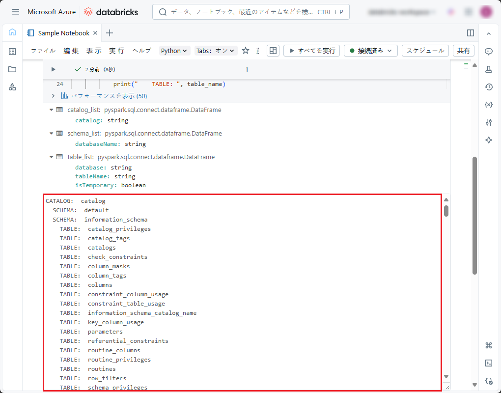 実行後、ユーザーがアクセス権限を持ったテーブル名とビューは、コードの末尾に表示され、該当のカタログとスキーマによって階層化されます。