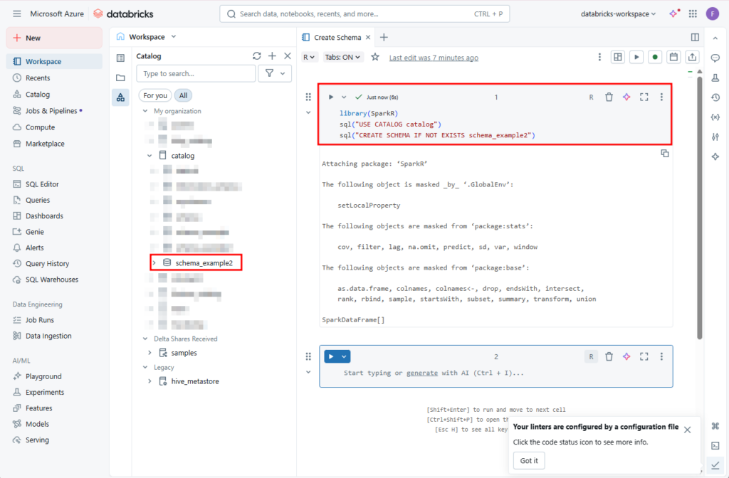 library(SparkR) sql("USE CATALOG example") sql("CREATE SCHEMA IF NOT EXISTS schema_example2") |