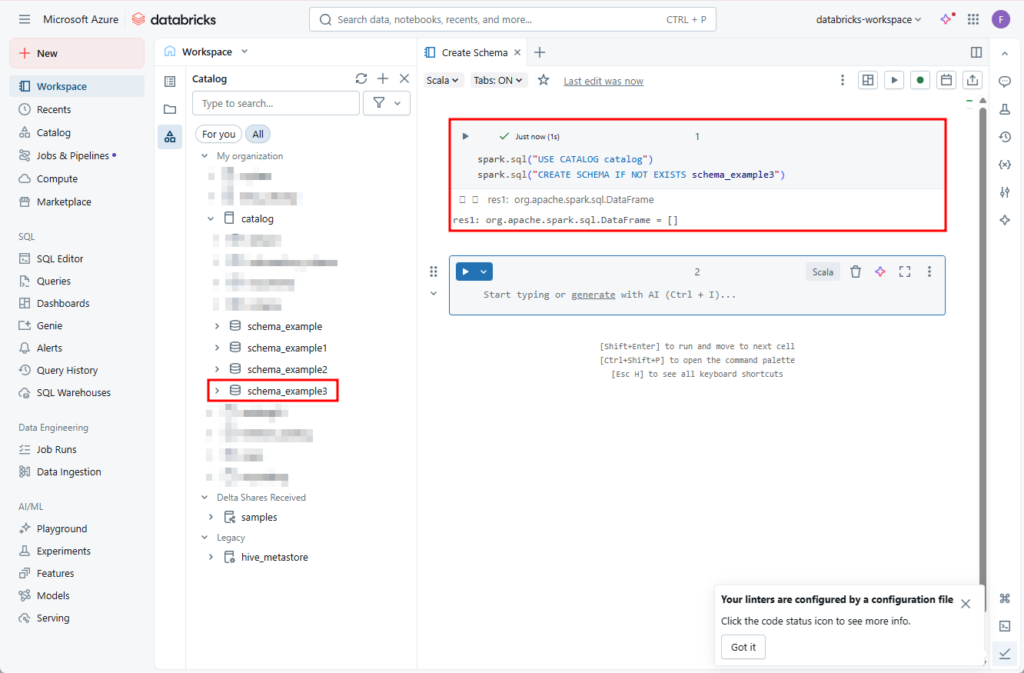 spark.sql("USE CATALOG catalog") spark.sql("CREATE SCHEMA IF NOT EXISTS schema_example3") |
