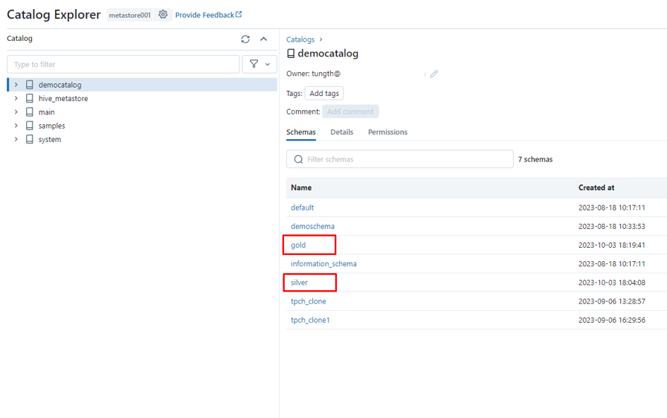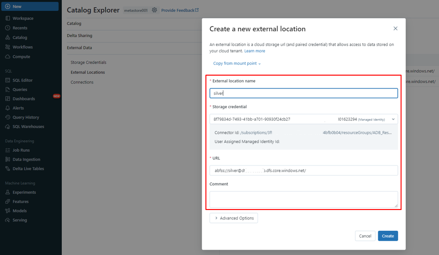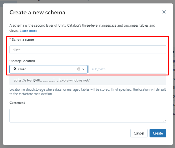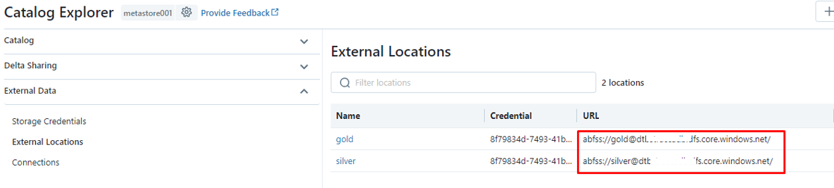 ② 作成されたコンテナに対応するシルバーレイヤーとゴールドレイヤーのスキーマを含む外部の場所を作成します。