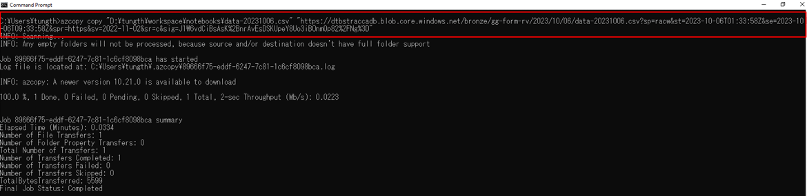 以下のazcopyコマンドを使用して、ストレージアカウントへこのCSVファイルをアップロードします。