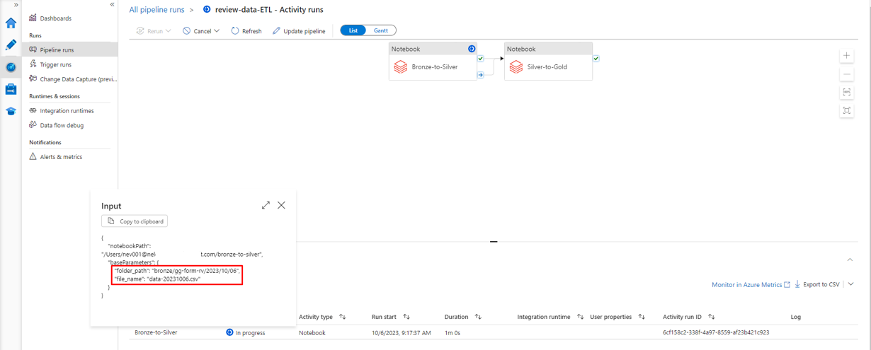 CSVファイルがアップロードされると、パイプラインがファイルパスというノートブックの入力値でトリガーされます。