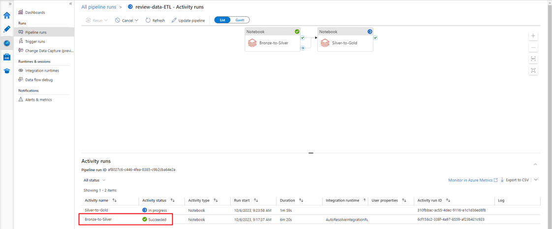 ブロンズのデータがソースデータと同じで、変更されないので、データをロールバックした後、パイプラインのみを再実行します。