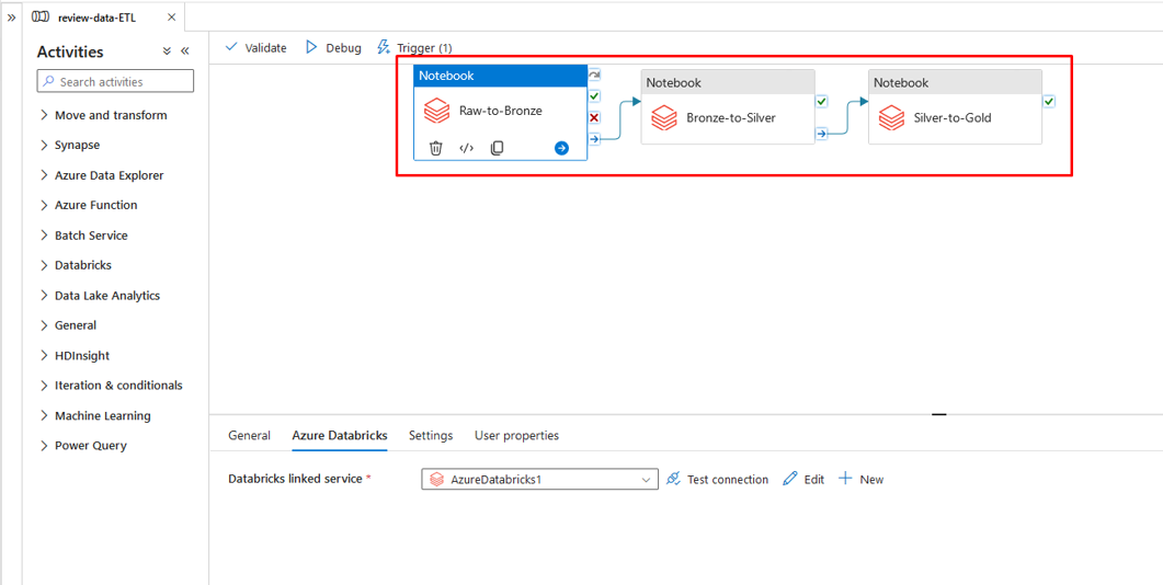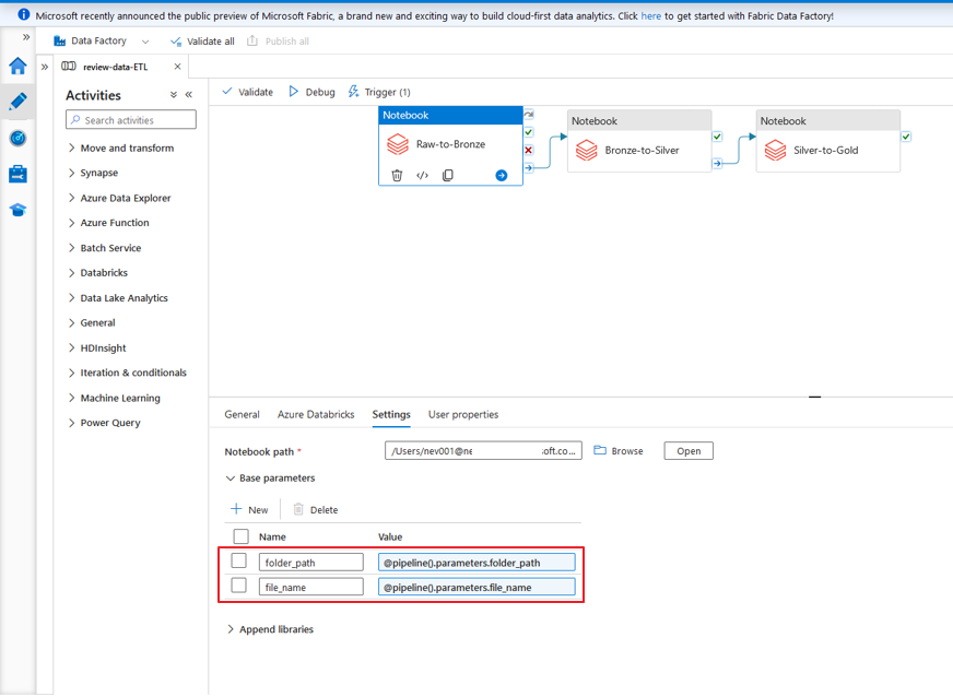 今回の例では、ファイル受信を想定しているためADFを使用します。パイプラインの実行手順は次の図の通りです。各ノートブックが、レイヤーでデータのフィルターを実行します。