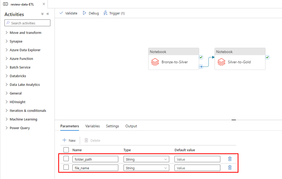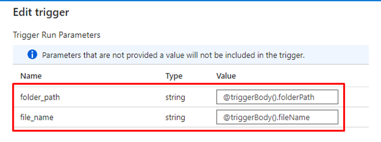 ③ ストレージアカウントへのアップロードした新規ファイルのパスをノートブックが取得できるようにトリガーとパイプラインのパラメーターを設定します。
