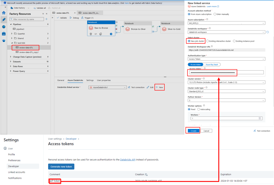 ① 今回の例では、ストリーミングデータではないので、ADFを使用してパイプラインを実行します。Databricksへ「new job cluster」新規ジョブクラスターで接続するように設定するので、パイプラインがトリガーされると新規クラスターが起動されます。Databricks ワークスペースからアクセス トークンを取得します。
