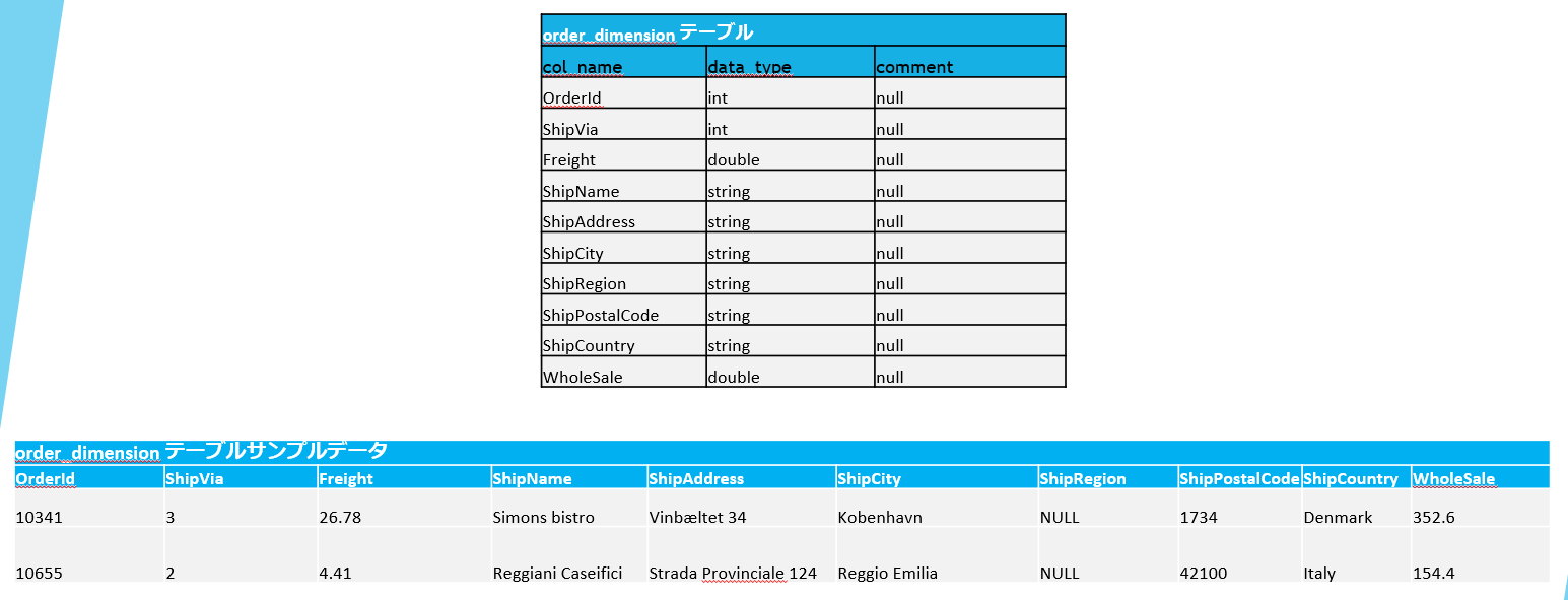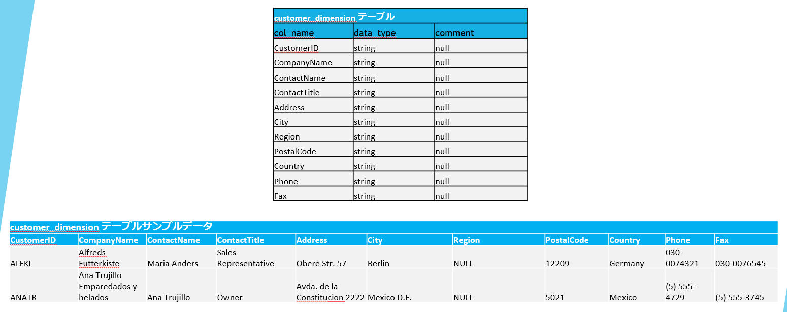 • Dimension:国別情報 (customer_dimension テーブル内) があり、「[CustomerID] = [f_custkey]」キーを使用して [fact] テーブルに連携されます